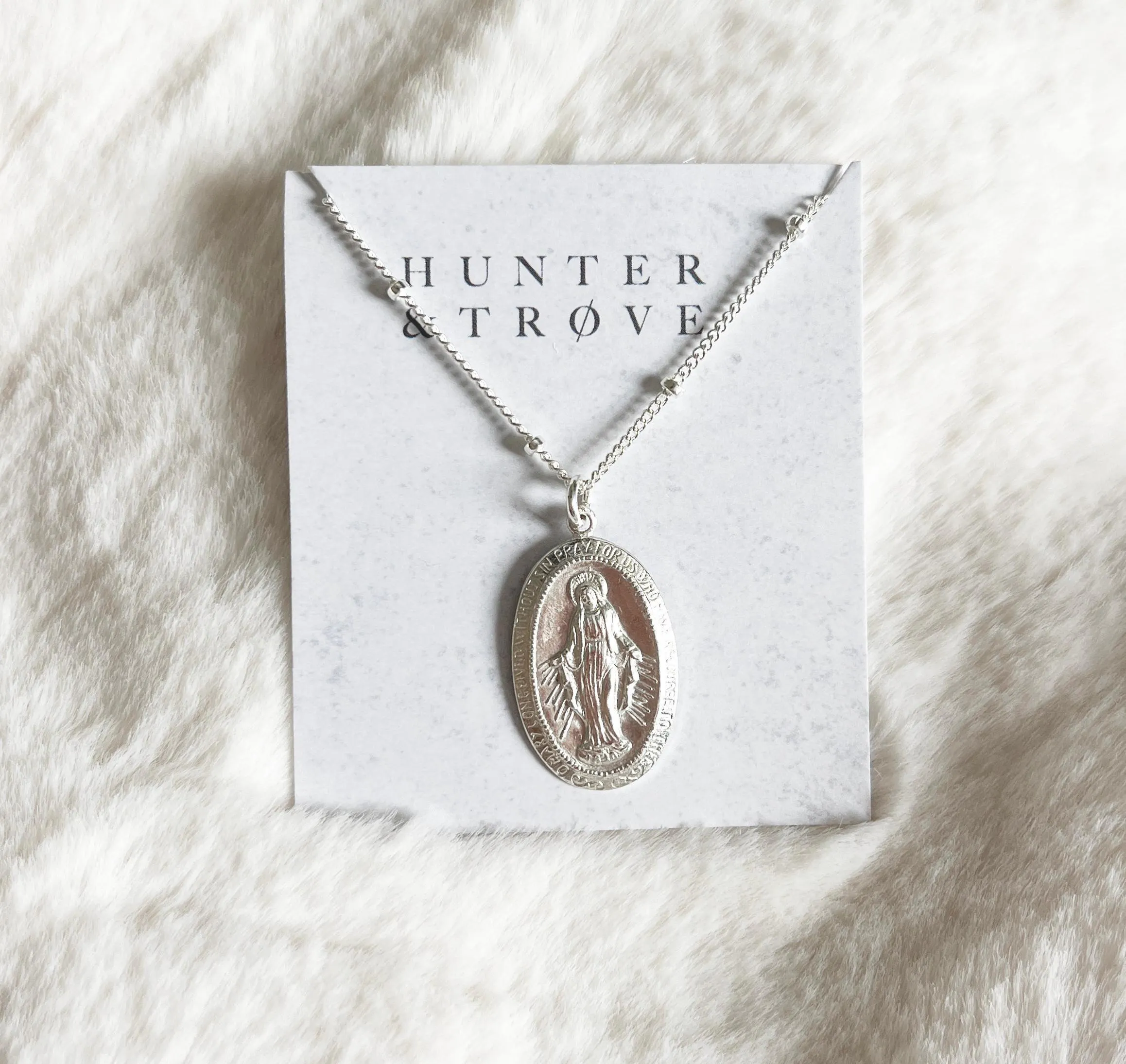 A softly luminous Virgin Mary necklace crafted in sterling silver, designed for everyday wear. Delicate in scale and gentle in movement, it brings a subtle sense of meaning whether worn alone or layered with other pieces.