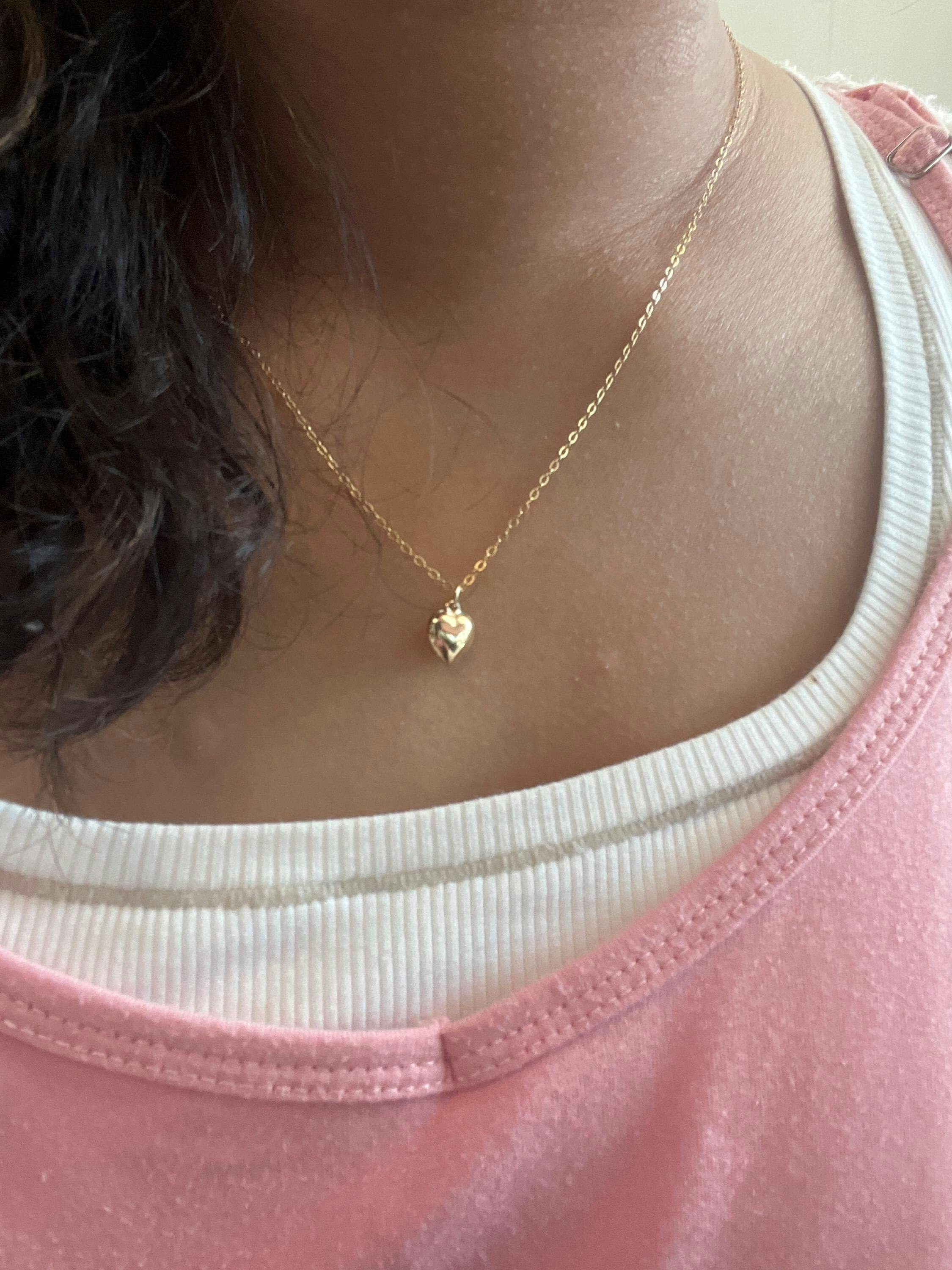 A petite heart pendant in 14K gold fill, defined by clean lines and quiet elegance. Designed for everyday wear, it offers a subtle expression of meaning and a refined finish, whether worn alone or layered with ease.