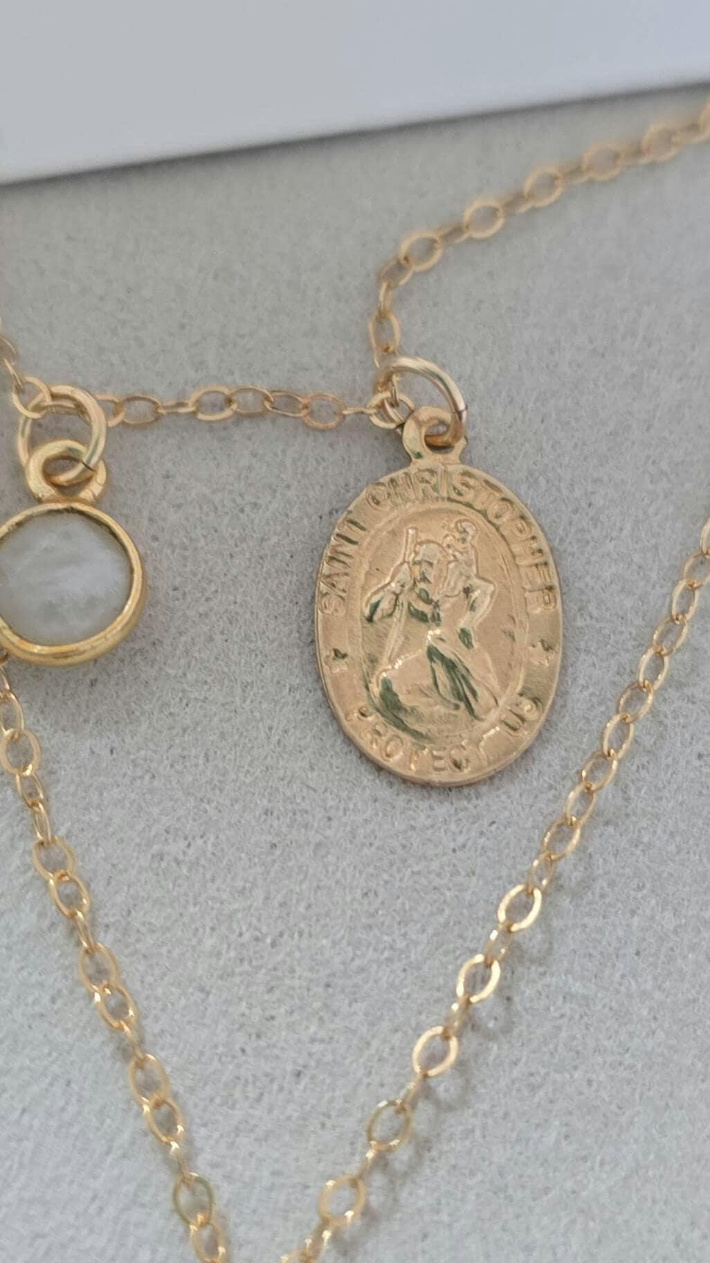 Our petite Saint Christopher traveler's necklace is perfect for everyday, a little shimmering piece that looks amazing layered, or dainty on its own. Adorned with a tiny moonstone gem.